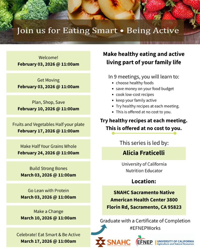 Ready to eat better and save money? Healing Ways is teaming up with UC Cooperative Extension, Sacramento County for the “Eating Smart-Being Active” workshop series! We’re offering nine free classes led by UC Nutrition Educator Alicia Fraticelli. Classes will take place in our Healing Ways Teaching Kitchen and will focus on preparing healthy, budget-friendly recipes. Participants who complete the series will receive a Certificate of Completion.