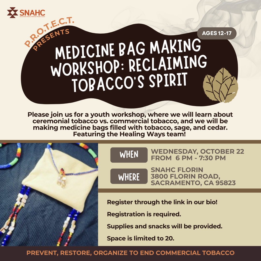 Please join us for a workshop on Wednesday, October 22nd from 6-7:30 PM, where we will learn about Ceremonial Tobacco vs. Commercial Tobacco in our community and we will be making Medicine Bags filled with tobacco, sage, and cedar. Traditional medicine that reconnects us with our ceremonies and cultural practices. Conversation will be led by Sage LaPena and her team Healing Ways will also be assisting us in learning about these traditional plants. Medicine bags will be led by Corrina Snow.