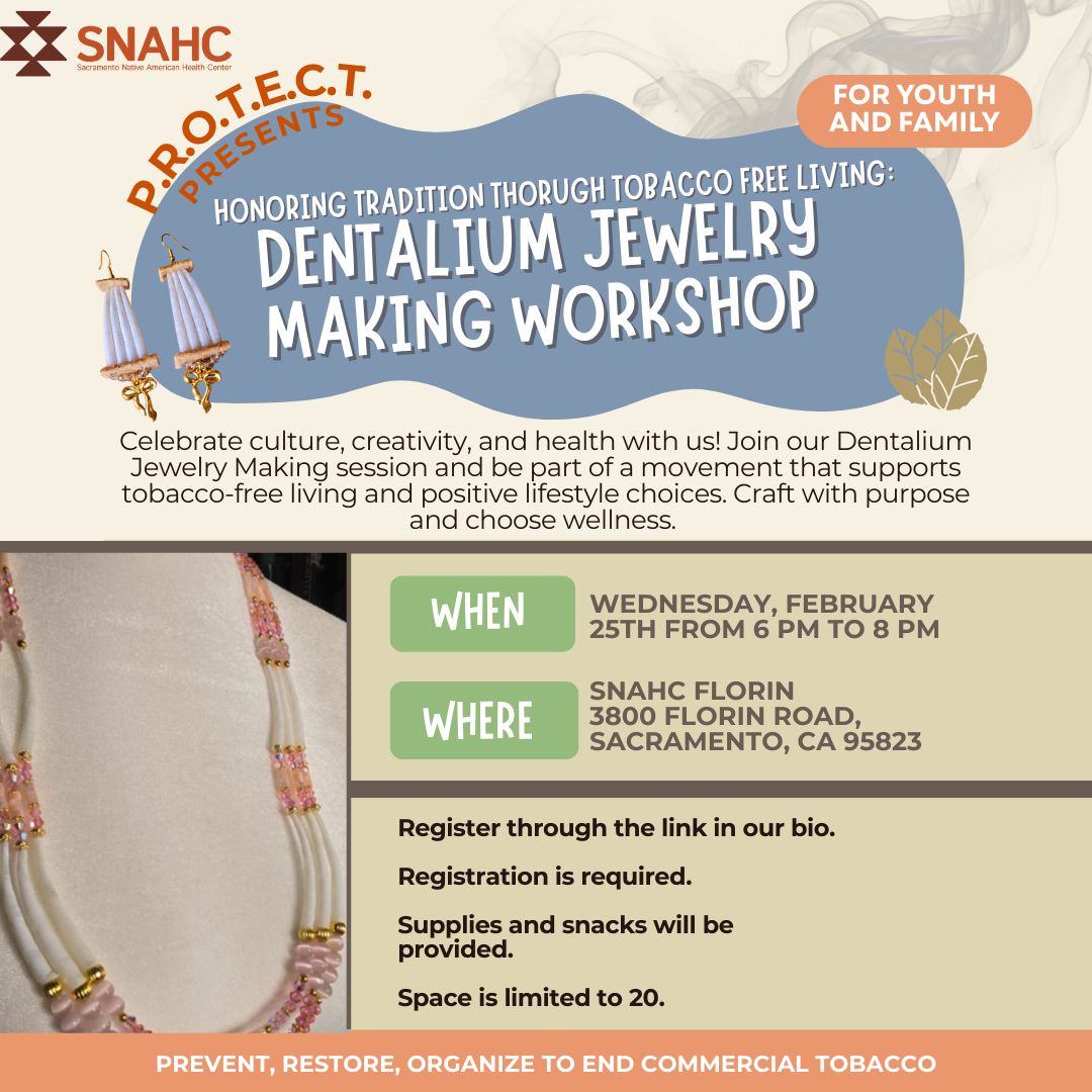 Celebrate culture, creativity, and health with us! Join our Dentalium Jewelry Making session and be part of a movement that supports tobacco-free living and positive lifestyle choices. Craft with purpose and choose wellness.