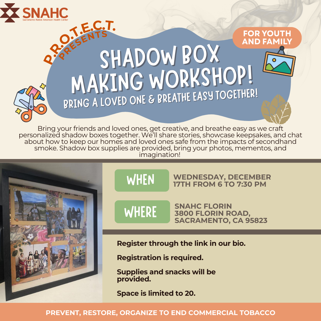 We are inviting youth to join us for a fun shadow box making workshop on Wednesday, December 17th from 6 PM to 7:30 PM! During this workshop, we will chat about the safety and the impact of secondhand smoke. Bring your keepsakes, photos, and your creativity! ✂️✨
