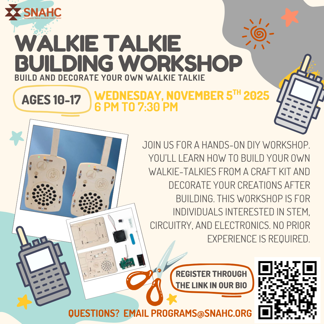 Join us for a hands-on DIY walkie-talkie workshop for ages 10-17 on Wednesday, November 5th, from 6 PM to 7:30 PM at SNAHC Florin! You’ll learn how to build your own Walkie-Talkies from a craft kit and decorate your creations after building. This workshop is for individuals interested in STEM, circuitry, and electronics. No prior experience is required! Please register through the QR code below!