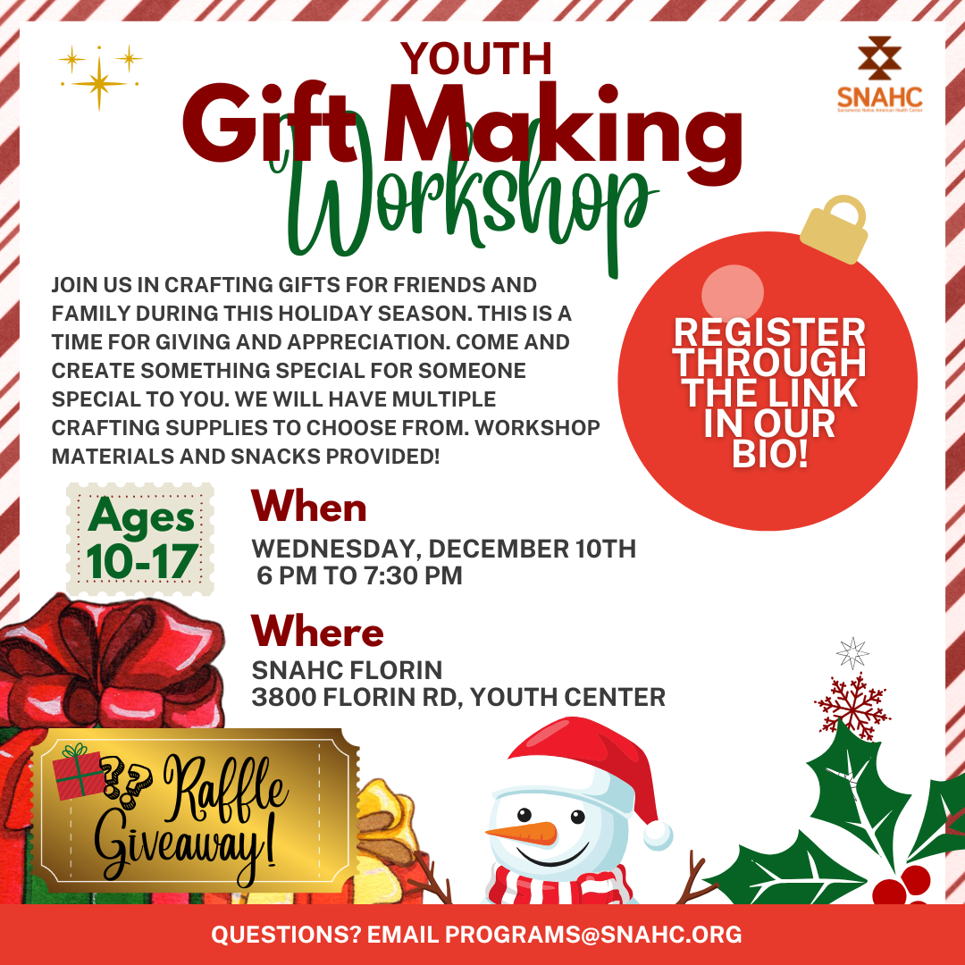 We are inviting youth between the ages of 10-17 to join us in crafting gifts for friends and family during this holiday season!This fun and festive workshop will be on Wednesday, December 10th from 6 PM to 7:30 PM! We will even have a raffle giveaway, so you won’t want to miss this!
